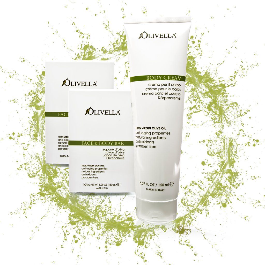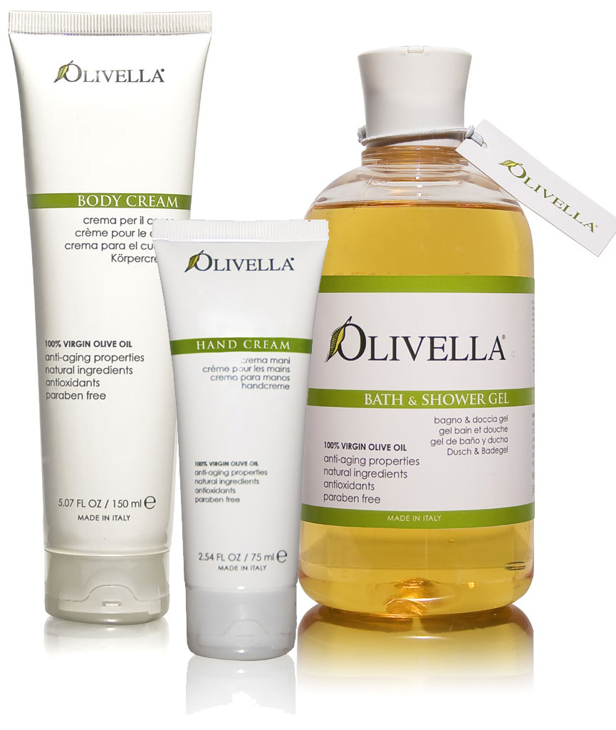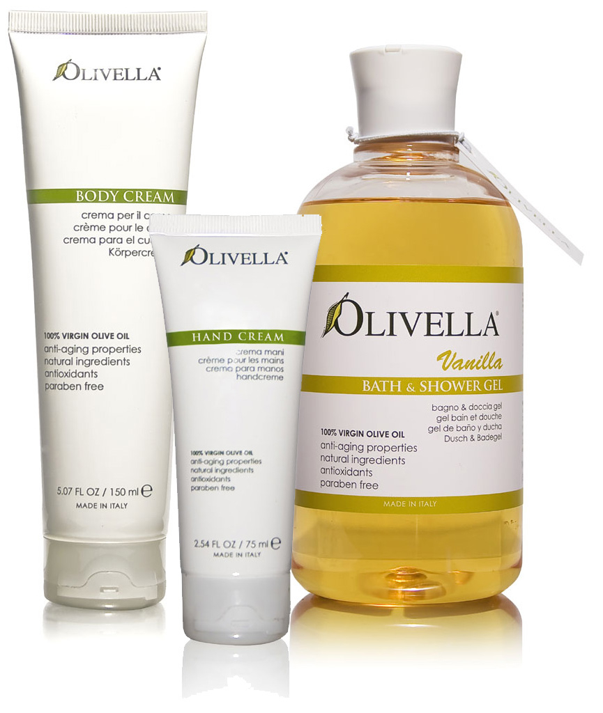 1 Olivella Bath/Shower Gel 16.9 oz. 1 Olivella Body Cream 5.07 oz. 1 Olivella Hand Cream 2.54 oz.