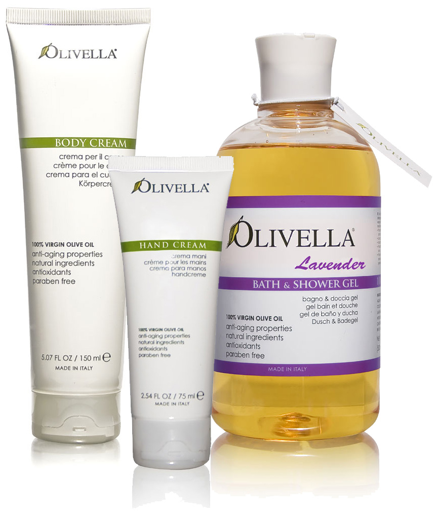 1 Lavender Bath/Shower Gel 16.9 oz. 1 Olivella Body Cream 5.07 oz. 1 Olivella Hand Cream 2.54 oz.
