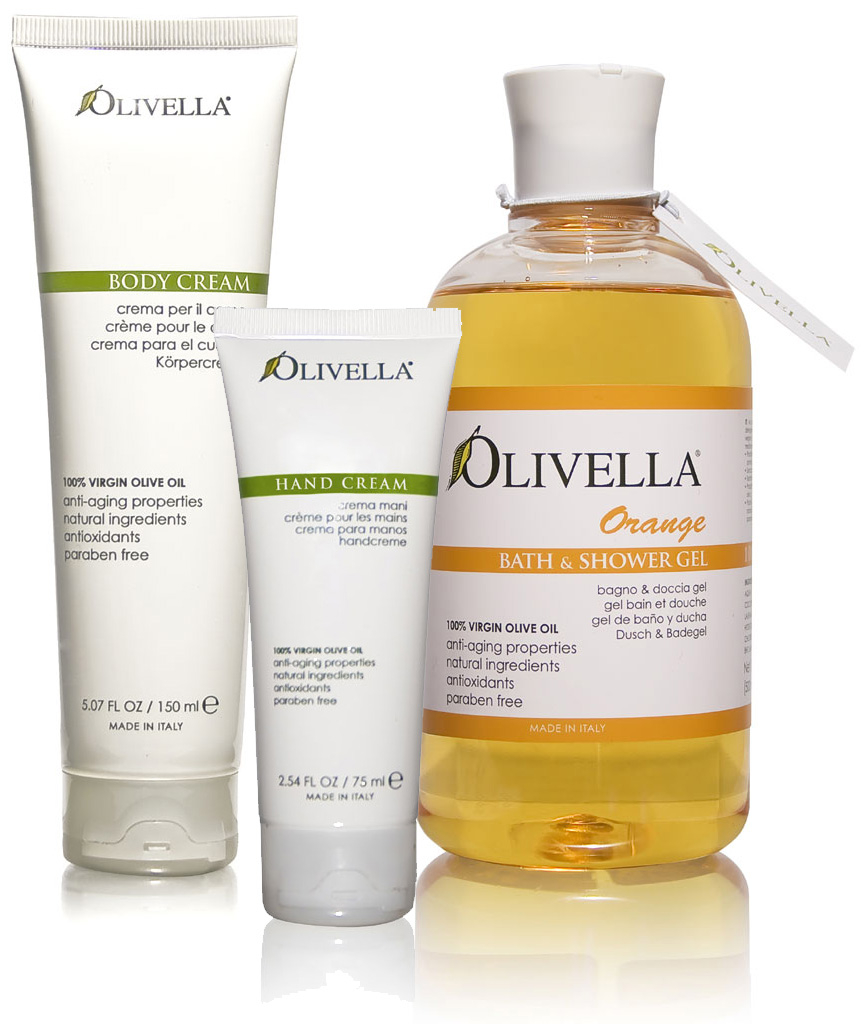 1 Orange Bath/Shower Gel 16.9 oz. 1 Olivella Body Cream 5.07 oz. 1 Olivella Hand Cream 2.54 oz.